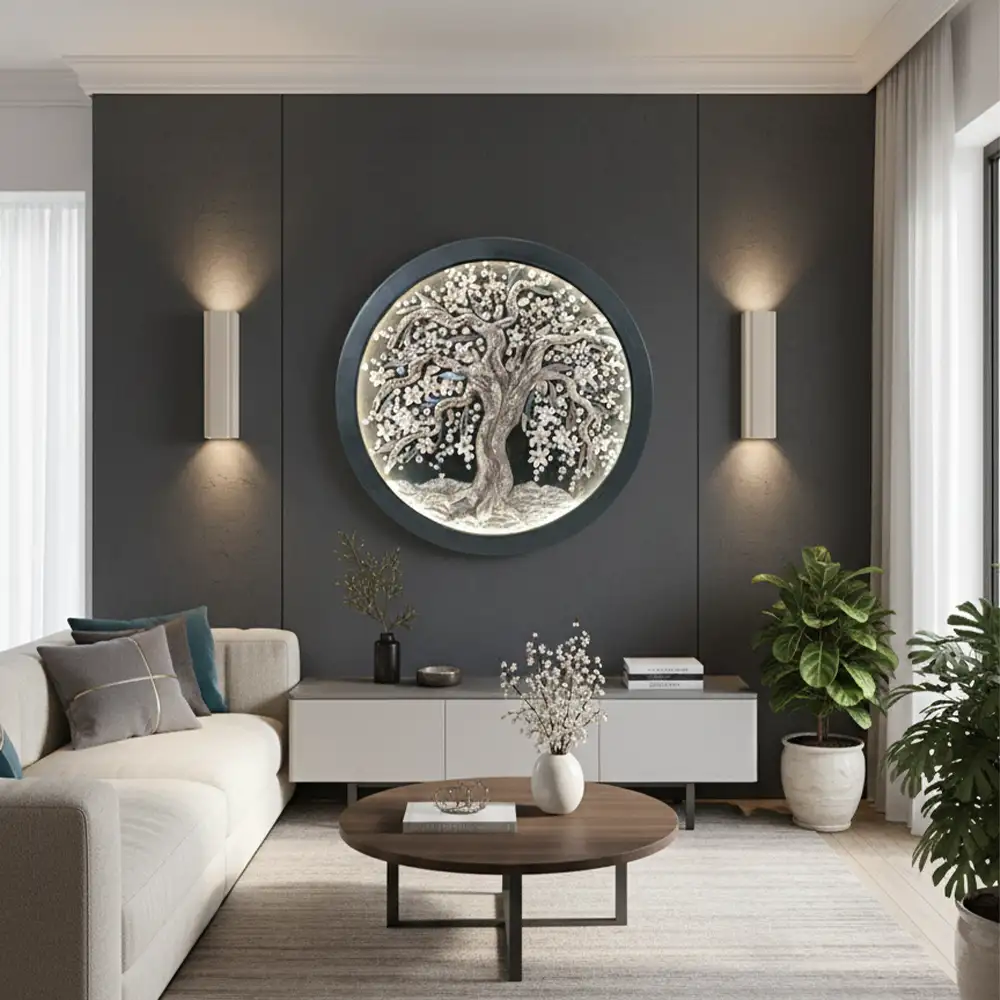 تابلو چراغ دار طرح درخت؛ تلفیق هنر، نور و دکوراسیون مدرن