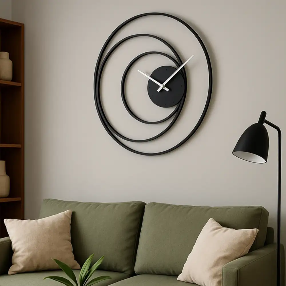 برخلاف ساعت های سنتی، در ساعت دیواری مدل Space خبری از اعداد یا فرم های شلوغ نیست. خطوط متقاطع، حلقه های فلزی و فرم هندسی خاص آن، جلوه ای کاملاً مدرن ایجاد می کند. همین ویژگی باعث می شود این ساعت به راحتی در کنار عناصر دکوراتیو minimal، futuristic یا industrial قرار بگیرد.
