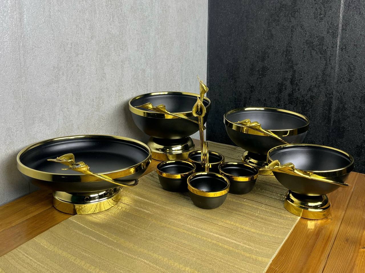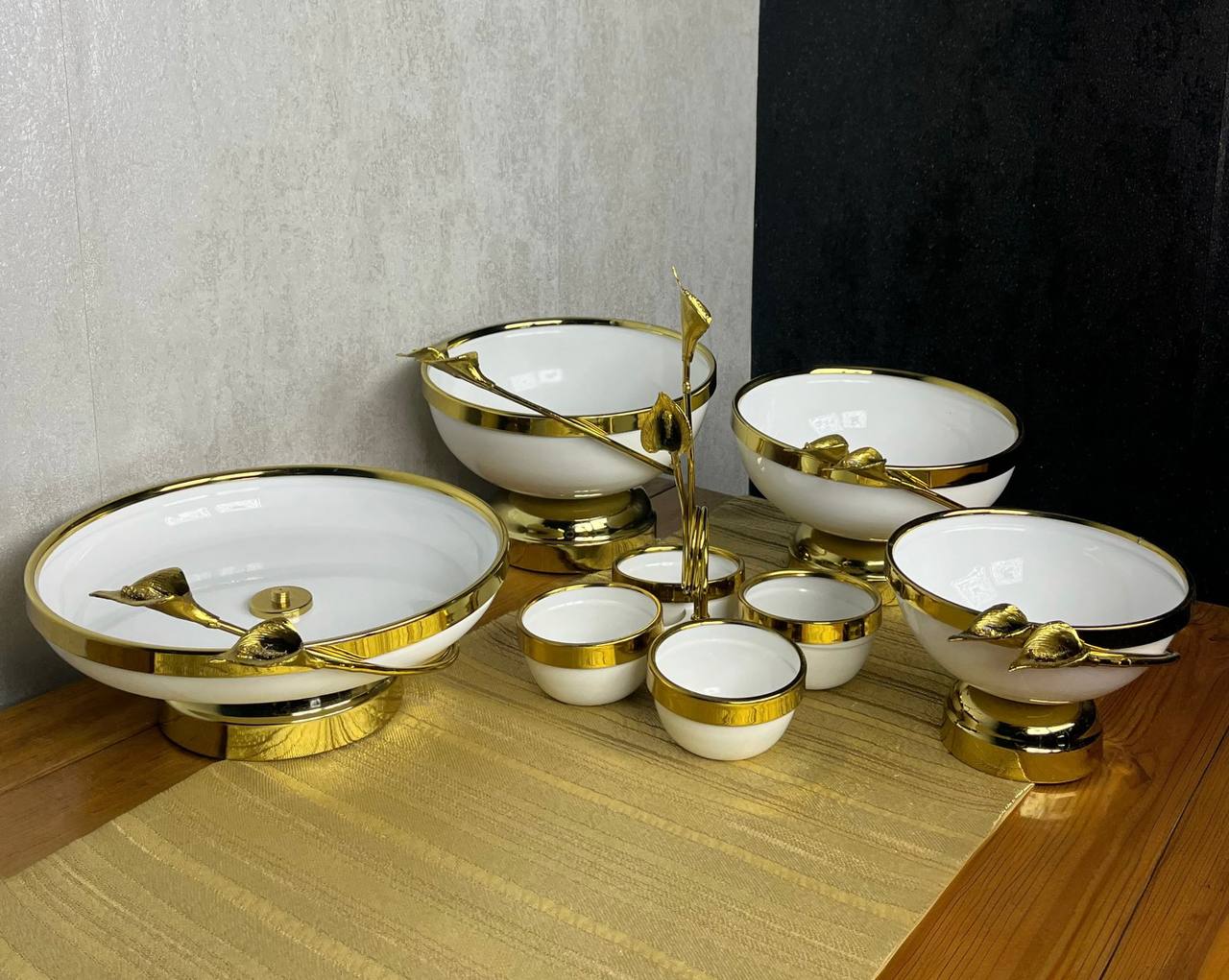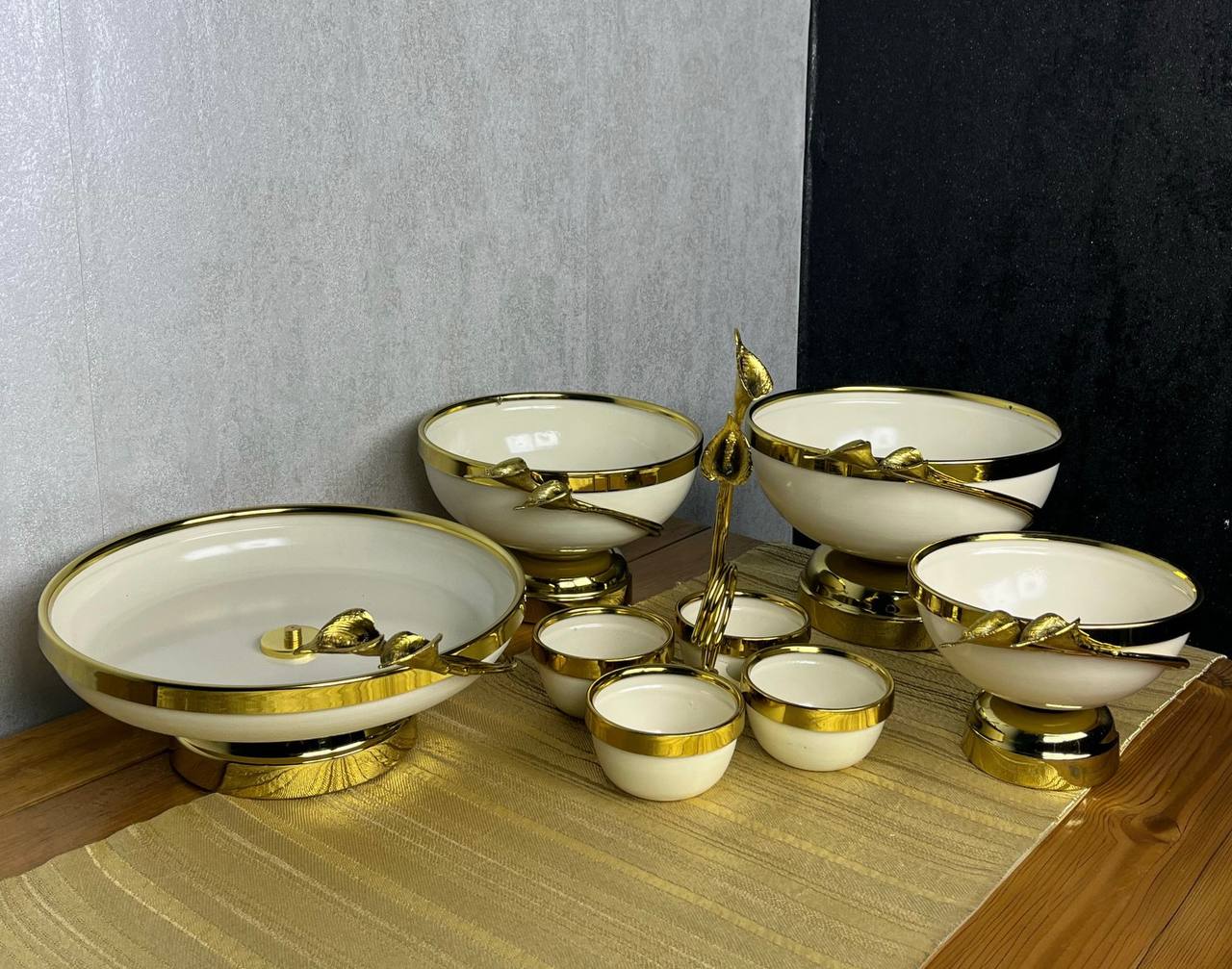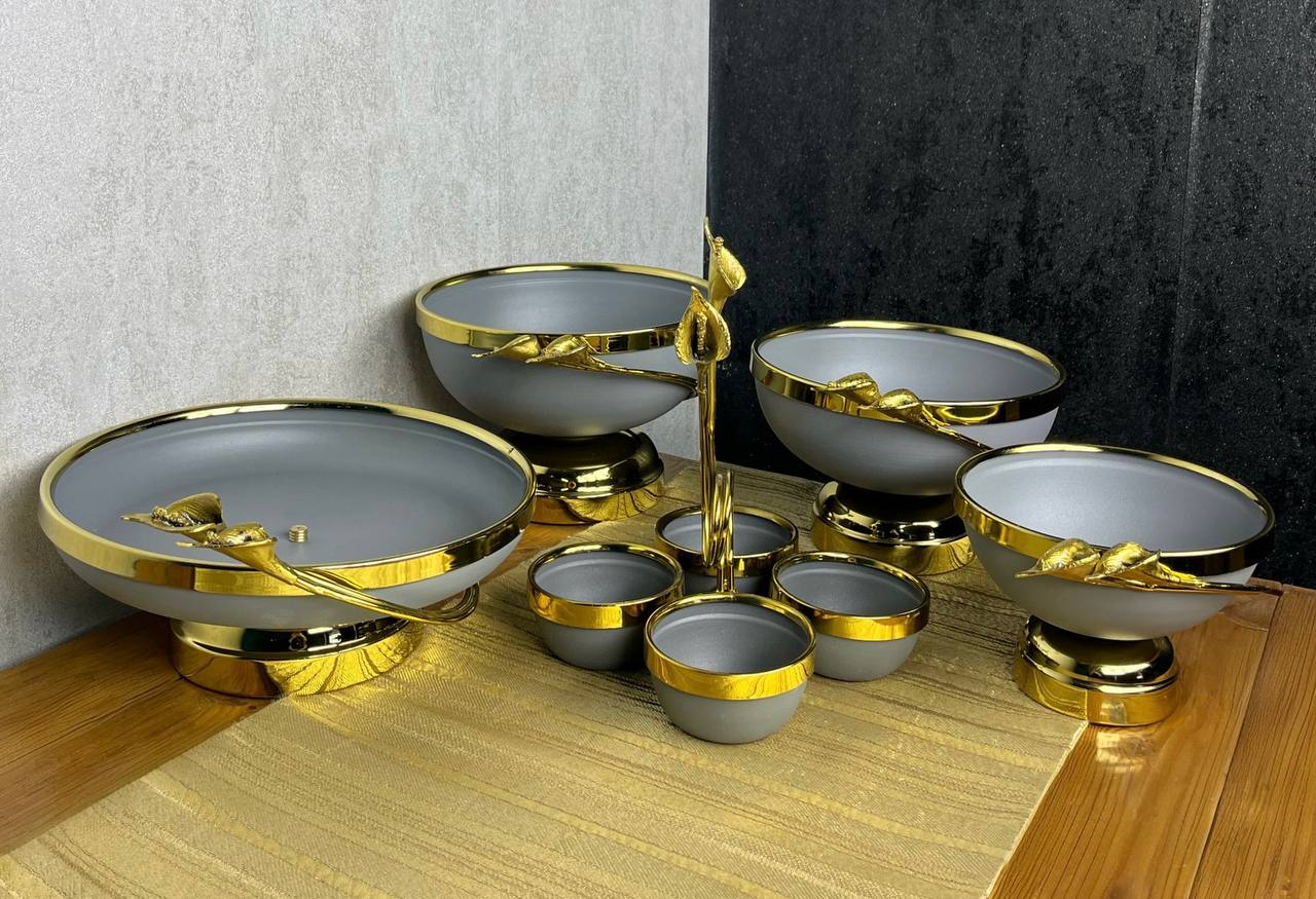 این ست شامل چندین کاسه در اندازه های مختلف، ظرف های سرو پیش غذا و دسر، به همراه برگ های لیلیومی است. ترکیب کامل این سرویس باعث میشود بتوانید برای سرو انواع خوراکی ها مثل میوه، آجیل، شیرینی، دسر و سالاد از آن استفاده کنید.