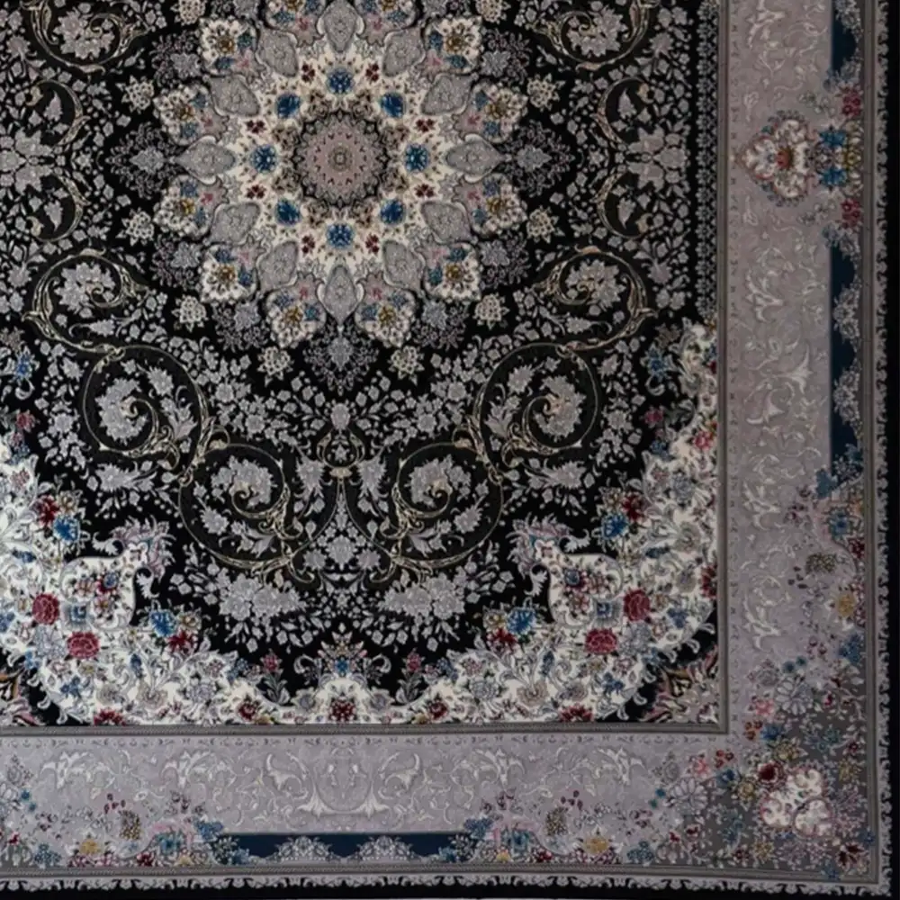 فرش ماشینی 700 شانه نگین فیروزه مدل شاهانه سرمهای؛ انتخابی اصیل برای دکوراسیون ایرانی